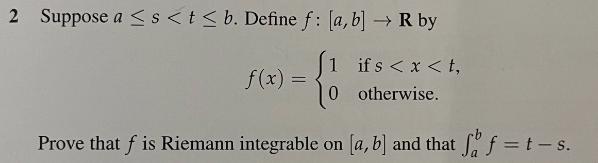 Till din uppgift: Prova följande partition under förutsättningen att vi har strikta olikheter hela vägen efter "Suppose...". : A = B =mängden av a, (a, s)), (s, t)), (t, b) och mängden av b. (Som du märker förfogar jag inte över varken mängdsymboler eller klamrar så läs dubbelparentes )) som klammer). Det är fritt för dig att som partitioner använda enstaka punkter, öppna eller slutna eller halvöppna intervall så länge de är disjunkta och ändligt många. (I Lebesgue-integralen får du ha uppräkneligt oändligt många, så funktionerna kan bli rent sjövilda).