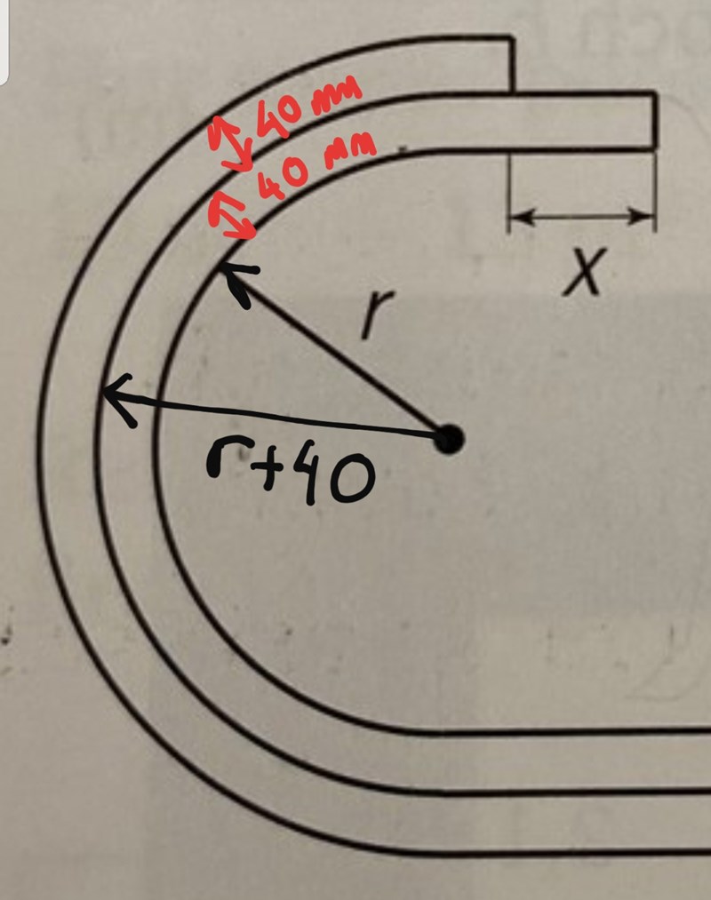 Der yttre röret ligger utanpå det inre röret, så den halvcirkelformen har radien r+40 mm, se figur.