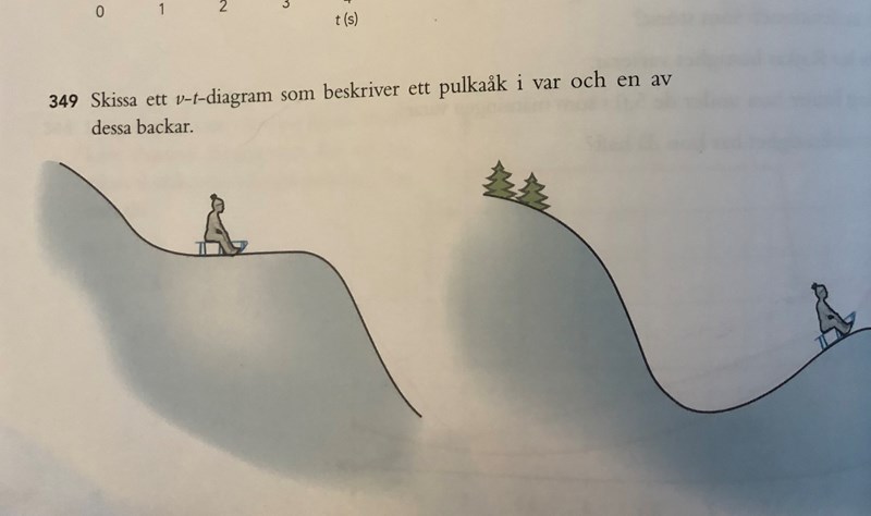Jag förstår inte hur jag ska tänka när jag ska skissa en vt graf utifrån dessa bilder. Däremot kan jag beskriva hur deras hastighet och acceleration ändras under pulkåkningens gång.