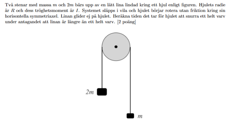 Jag har nu en fråga. Sambandet gäller ju i detta fall magnituden av och . Jag har som synes i min bild definierat rörelse nedåt (i den tyngre stenens rörelseriktning) som positiv så då blev storleken rörelsemängdsmomenten av för de två stenarna samt . Till denna summa adderade jag "rörelsemängdsmomentet" för hjulet, . Men har denna någon "riktning"? Jag tänkte att hjulet snurrar "åt samma håll" som stenarna rör sig, dvs. vi borde ha positivt tecken, men jag vet inte... Min fråga är alltså hur jag ska veta att man ska lägga till hjulets rörelsemängdsmoment (vilket jag gjorde) istället för att subtrahera det.