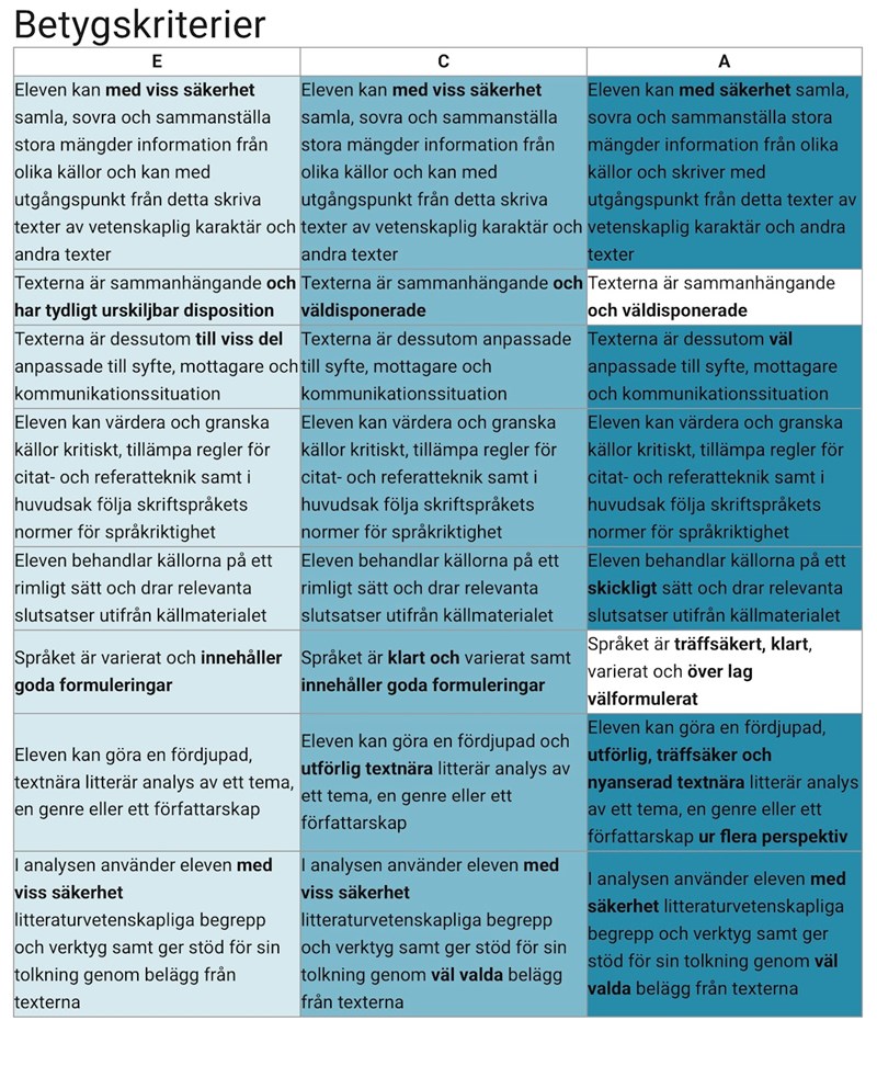 Jag fick precis tillbaka resultatet från en diktanalys jag har skrivit i sv 3 och fick det här resultatet av min lärare (färgat betyder att man uppnår kriteriet, vitt betyder att man inte uppnår kriteriet):