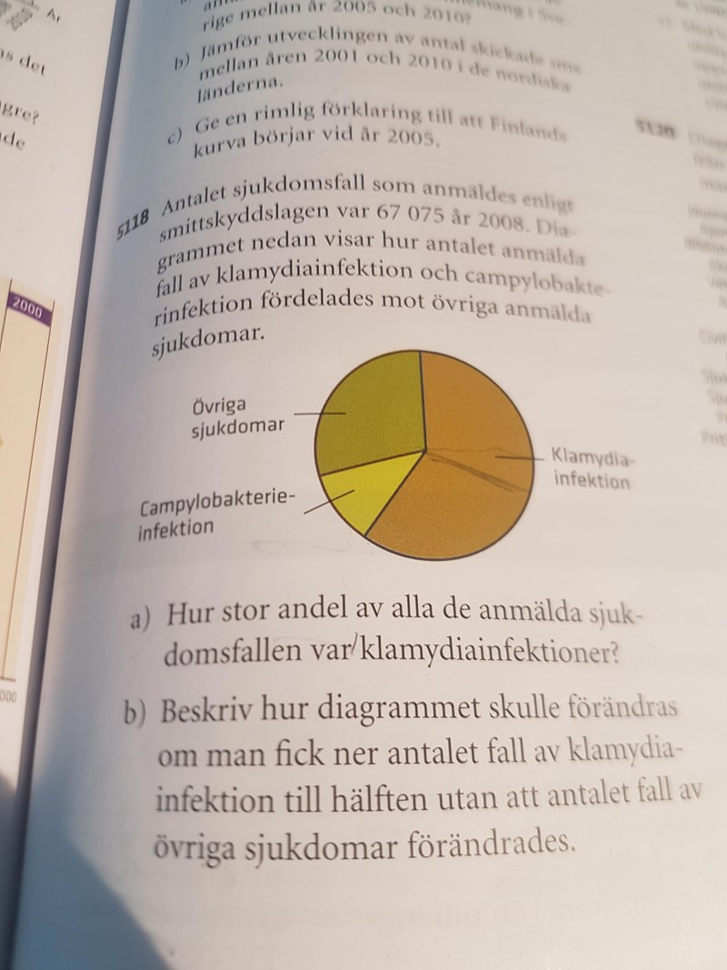 Om totala antalet sjukdomsfall är X, så vet du att (andelen med Klamydia)*X= 67 075. Kan du lösa X? Efter att du löst ut X, så vet du då att antalet anmälda fall av campylobakterinfektion är (andelen med campylo~)*X, liknande sätt för övriga sjukdomar.