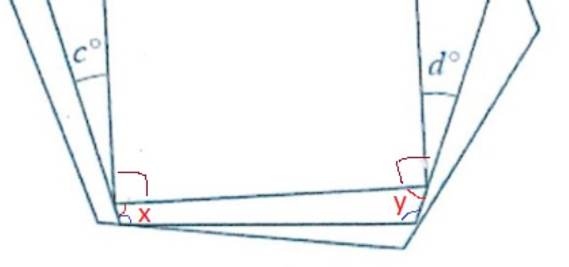 De inre vinklarna i pentagonen är kända, blå i min bild. De inre räta vinklarna i kvadraten är heller inga konstigheter.