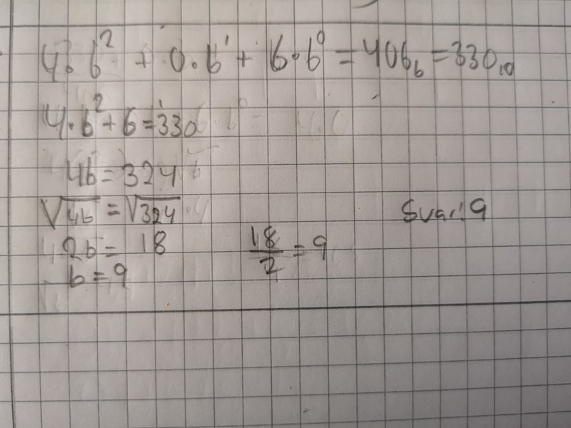 Vilket värde har basen b om likheten 330_10=406_b gäller?