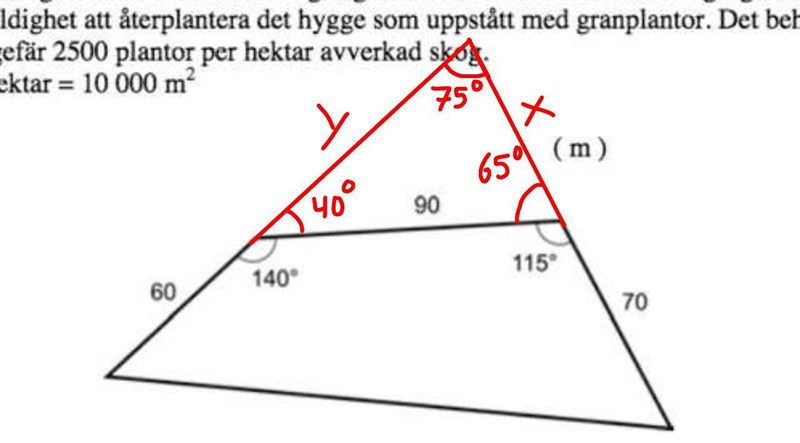 Hej sitter och repeterar inför ett prov och kom till denna uppgift. Jag har kört fast då jag tänkte att det går att dela den på mitten så att det blir två trianglar, dock så får jag det inte att gå ihop längre än så.