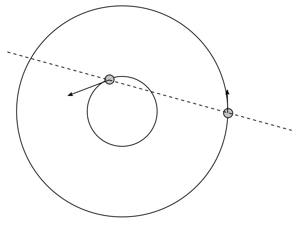 För realism kan du tar den inre planeten till jorden som har banradie 1 AU och banhastighet 30 km/s och yttre planeten till jupiter med banradie 5,2 AU och banfart 13 km/s. (Mars bana är för elliptisk för att ska vara rimligt)
