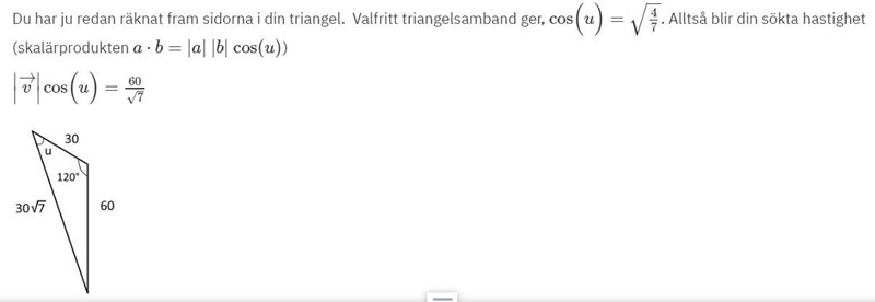 Du har ju redan räknat fram sidorna i din triangel.  Valfritt triangelsamband ger, cos(u)=47\cos(u)=\sqrt{\frac{4}{7}}. Alltså blir din sökta hastighet (skalärprodukten a·b=|a||b|cos(u)a\cdot b=|a|\,|b|\, \cos(u))
