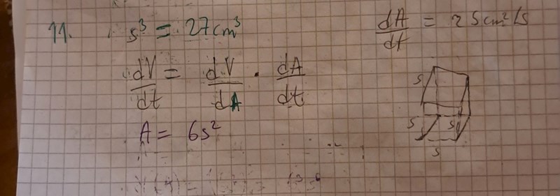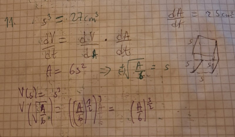 Aa jo det måste vara rimligt. Men om vi deriverar detta så har vi ingen aning vad A är ? dV/dA=3/2*sqrt(A/6). Jag vet ej om det är tänkt att lösa ut s ur s^3=27 cm^3 för då får vi s=3. då vet vi att A(3)=6*3^2=54 cm^2. Jag får dock