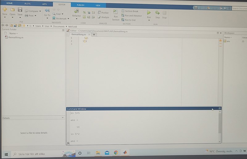 Så jag har flera uppgifter (1-7) jag ska göra i en och samma mathlab fil. Så jag löser de i Command Window ska jag sedan kopiera koden från Comand Window till editor för 1 om jag har uppgift 1?