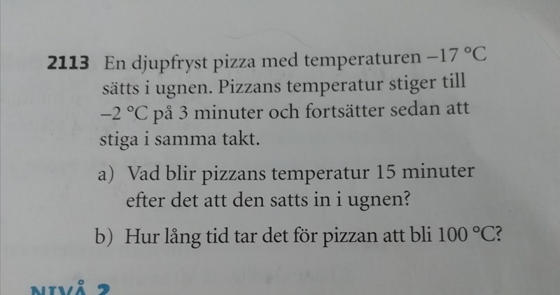 Qetsiyah skrev:Okej så från uppgiften ser vi att tempen ökar 15 grader på 3 minuter, det betyder 5 grader per minut precis som du skrivit. Vi skriver:
