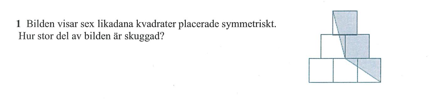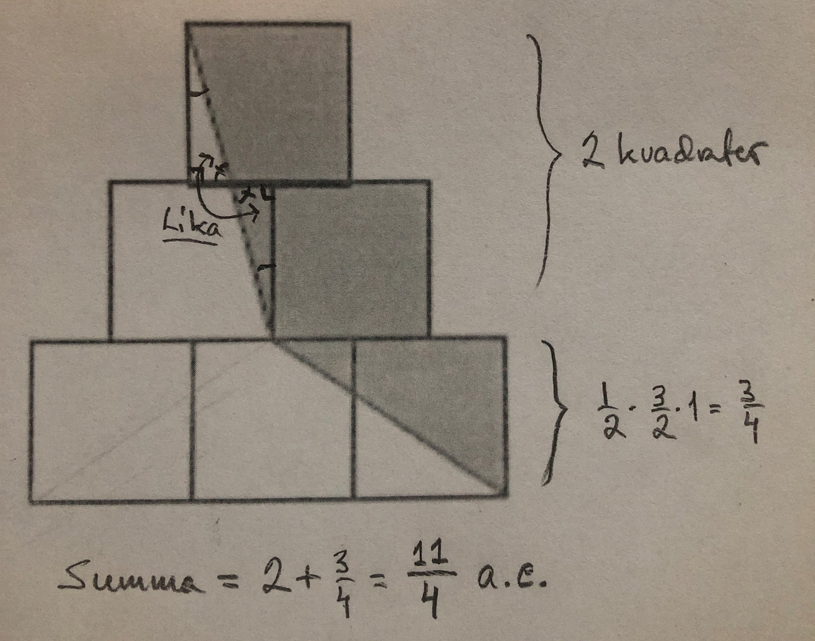 På den understa raden hade jag dragit en linje från toppen (mitten) till vänstra nedre kanten. Du får då en spegelbild av den högra blå ytan. Dessa tillsammans är lika stor som den vita ytan (Varför? Vad är höjden? Har de gemensam bas?)