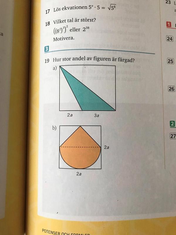 CurtJ skrev:Bra början, nu är det bara att se hur stor del triangelns area är av kvadratens. Det gör du genom att teckna relationen A1/A2 där A1 är triangelns area och A2 kvadratens. Med lite förenklingar blir det ett bra svar.
