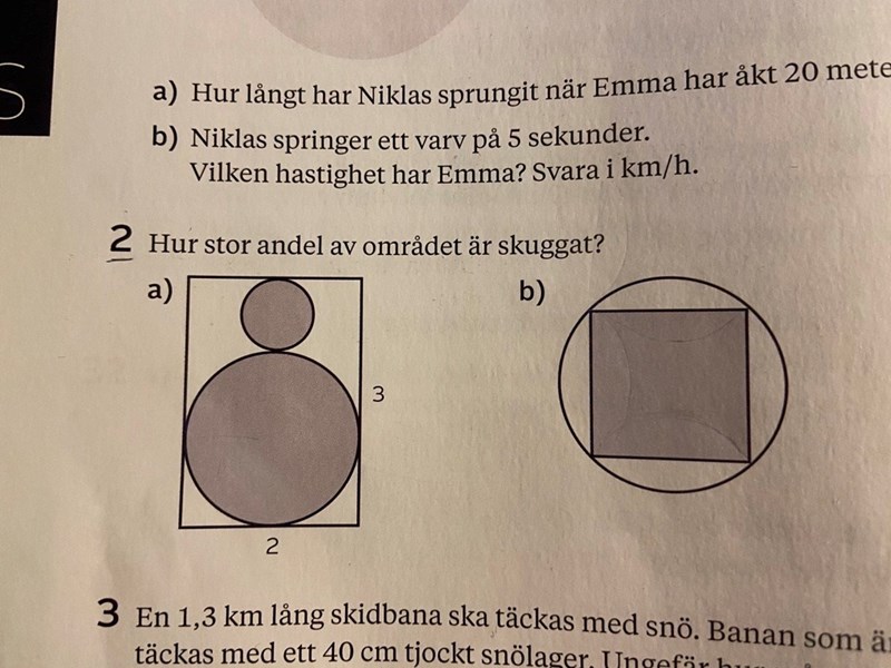 Min lösningar : a) Area av hela rektangel är 6, diameter av den stora cirkel är 2 dvs radie är 1 och area av den stora cirkel blir 3,14. Däremot den lila cirkel ha diameter 1 ( den stora cirkels diameter är 2 , så diameter av lila cirkel blev en eftersom längden av rektangel är 3-2=1) och area av lila cirkel är därför = 0,785, area av både cirklarna blev 3,925. 3,925/6 = 0,654 = 65,4%