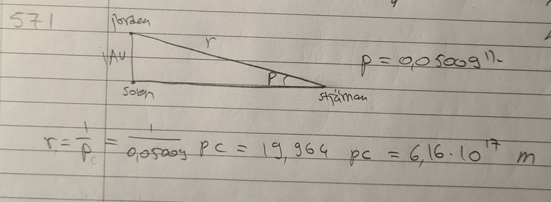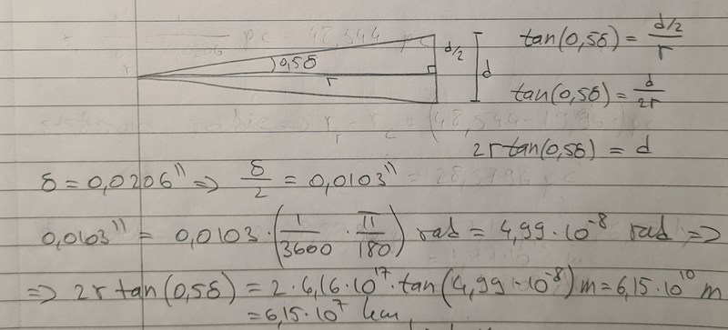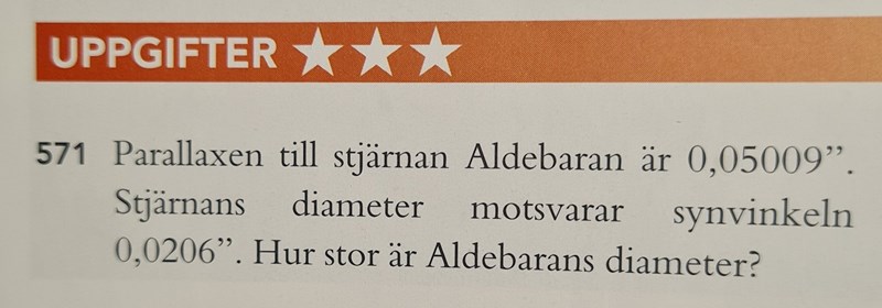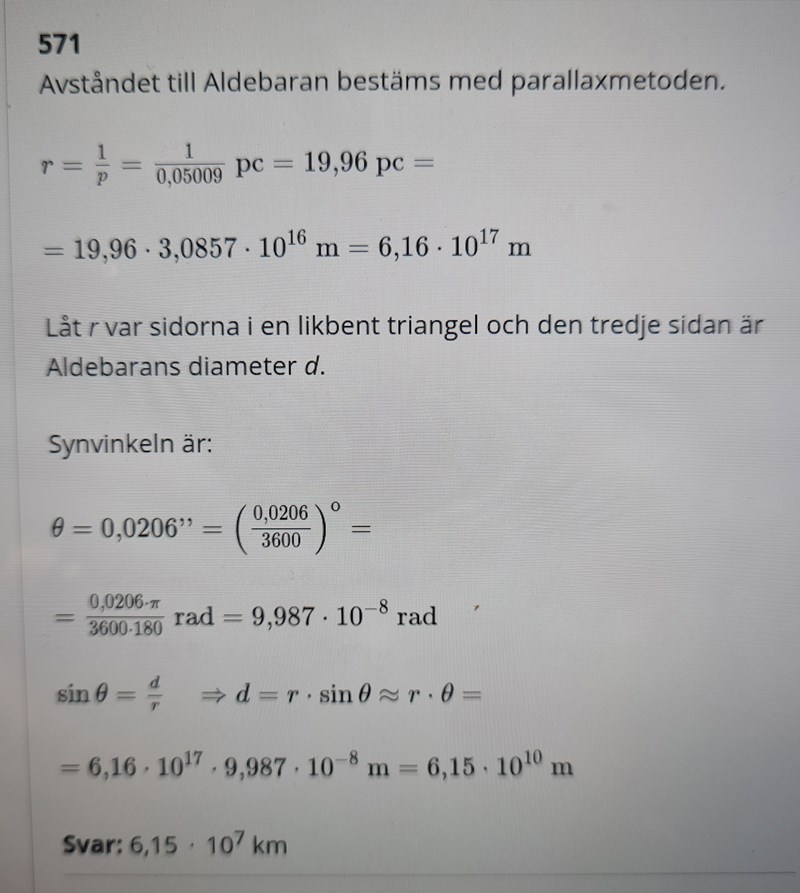 Men jag lyckades till sist bestämma diametern med hjälp av formeln för vinkeldiamater. Synvinkeln betecknar jag med grekiska "delta". Facits redogörelse kan jag inte begripa. Det är också viktigt att ställa in räknaren i radianer, annars får man felaktigt svar.