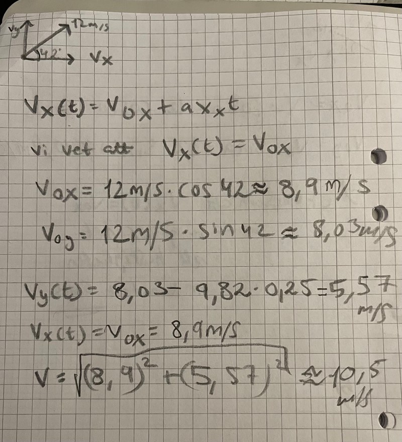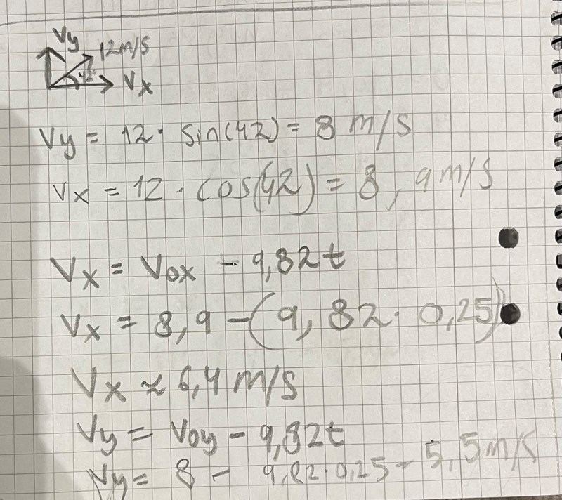 En boll kasta snett uppåt med begynnelsehastigheten 12m/s och i en riktning som bildar vinkeln 42 grader med horisontalplanet. Inget luftmotstånd. Hur stor är bollens hastighet efter 0,25s?