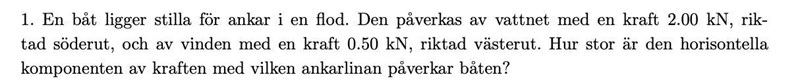 Två kraftkomponenter som drar i båten söderut och västerut. Om du bildar en resultant av dessa två (hur stor är den?) kommer den horisontella komponenten av kraften från linan vara lika stor men motsatt riktad.
