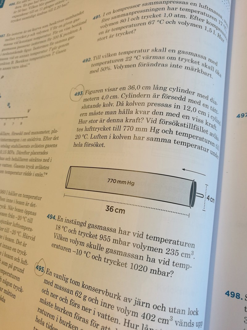 Smaragdalena skrev:När kolven är längst åt höger är det samma tryck inuti cylindern som utanför den, d v s lika med lufttrycket. Då är cylinderns volym lika med längden gånger tvärsnittsarean och längden är 36 cm.