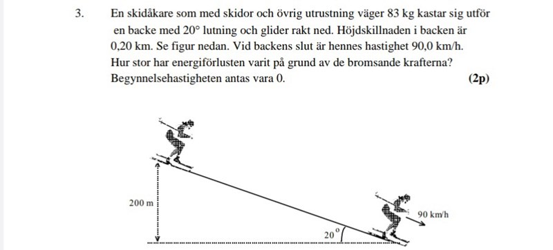 Hej, det kanske låter som en dum fråga, men vad är formeln för energiförlust? Jag tänker att i läge 1 har vi Ep, i läge 2 Ek1+Wf och i läge 3 Ek2+Wf. Men under färden har skidåkaren en hastighet som jag ej riktigt vet hur stor den är eftersom vid backens slut har hon en annan hastighet. I början är ju dennes hastighet 0.