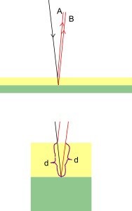 Det här är en förstoring från den första bilden. Det svarta strecket är det infallande ljuset. I punkten 1 reflekteras en del av ljuset och resulterar i strålen A.