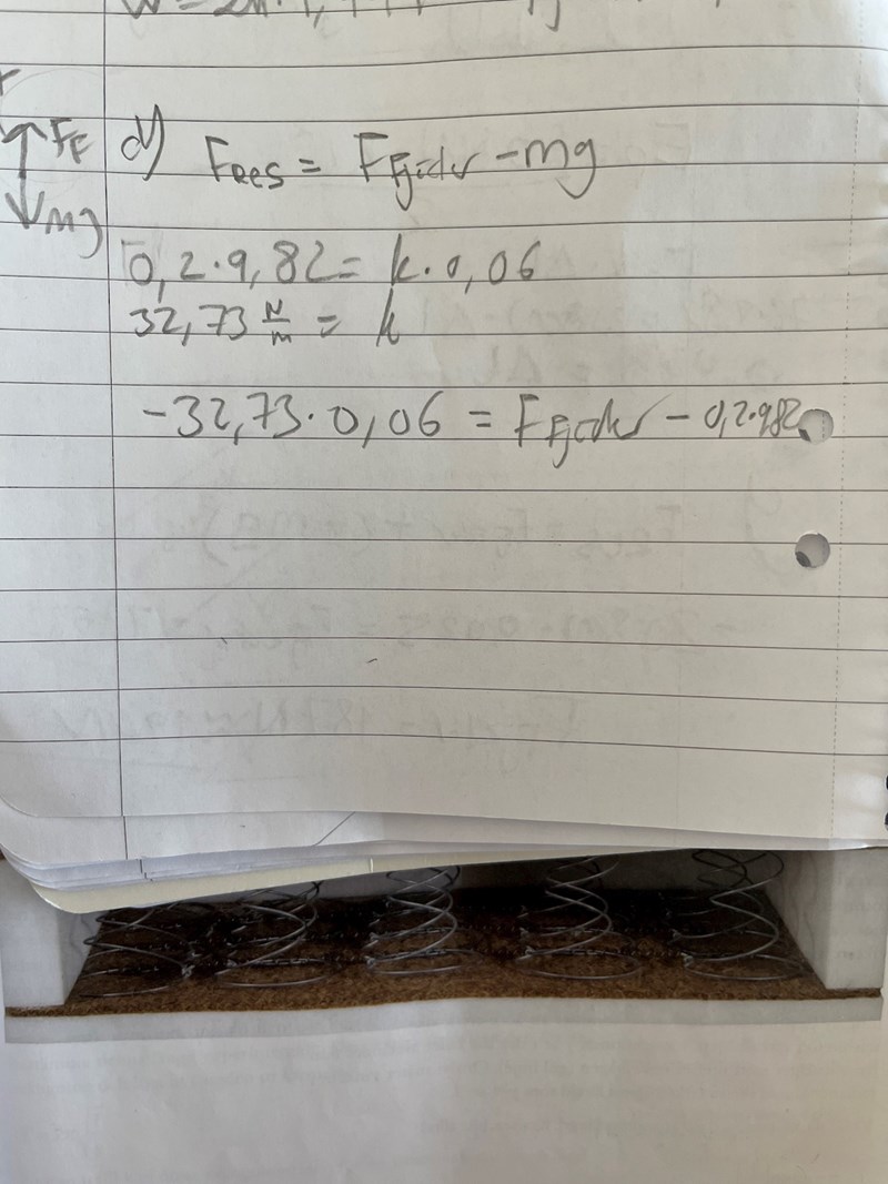 Så här tänker jag. Jag definierar positiv riktning uppåt. Min fråga är när jag beräknar F(res)=k*delta L så tar jag -32.73*0.06 men man måste ta gånger en negativ sträcka för att svaret ska bli rätt. Alltså måste jag ta -32.73*-0.06. Min fråga är varför ska man sätta in en negativ sträcka för att få rätt svar?