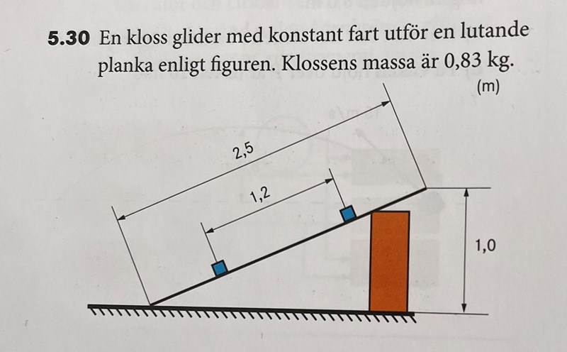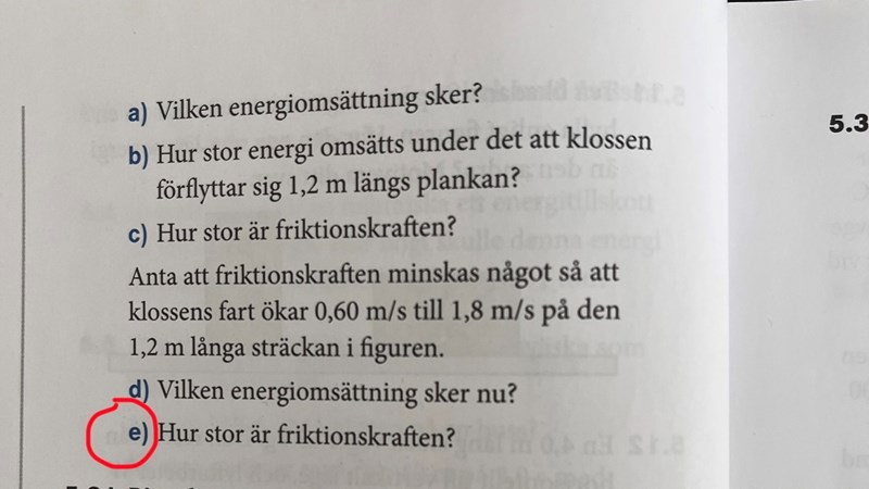 jag har försökt lösa uppgiften e med hjälp av energiprincipen där förluster ingår, Ep1+Ek1 = Ep2+Ek2+Wf