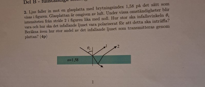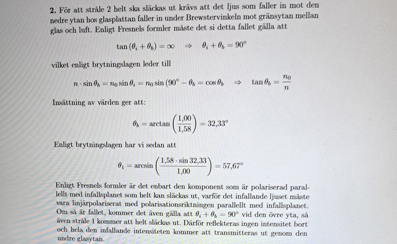 Jag har några frågor. Jag förstår inte varför facit skriver tan(vi+vb)=inf samt vi+vb=90 . Sen satte jag n1 till 1.58 och n2=1.00. Men jag räknade vinkeln b =90 medan facit använde använde brewstervinkeln för att räkna ut b vinkeln och sen stoppa in den för att räkna ut infallsvinkeln, vad är fel med min metod? De räknade inte heller ut andelen och för bara ett resonemang , det förstår jag inte. Varför hoppar de över att räkna ut andelen?