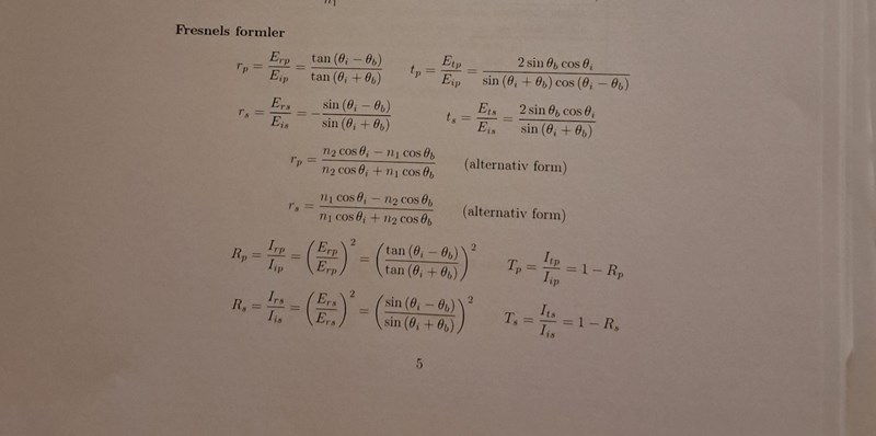 Dr. G skrev:Från Fresnels ekvationer så kan man se att p-polarisationen inte reflekteras när θi + θb = 90°, då tangens av denna vinkel blir oändligt och man har tan(θi + θb) i nämnaren för reflexionskoefficienten.