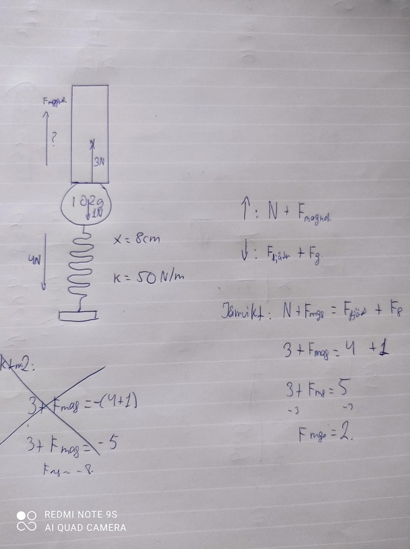 Det enda lösningen jag har om kontaktkraften skulle verka nedåt, då blir det 8N. Något sånt, Fmagnet=Ffjäder+Fg+Fk.
