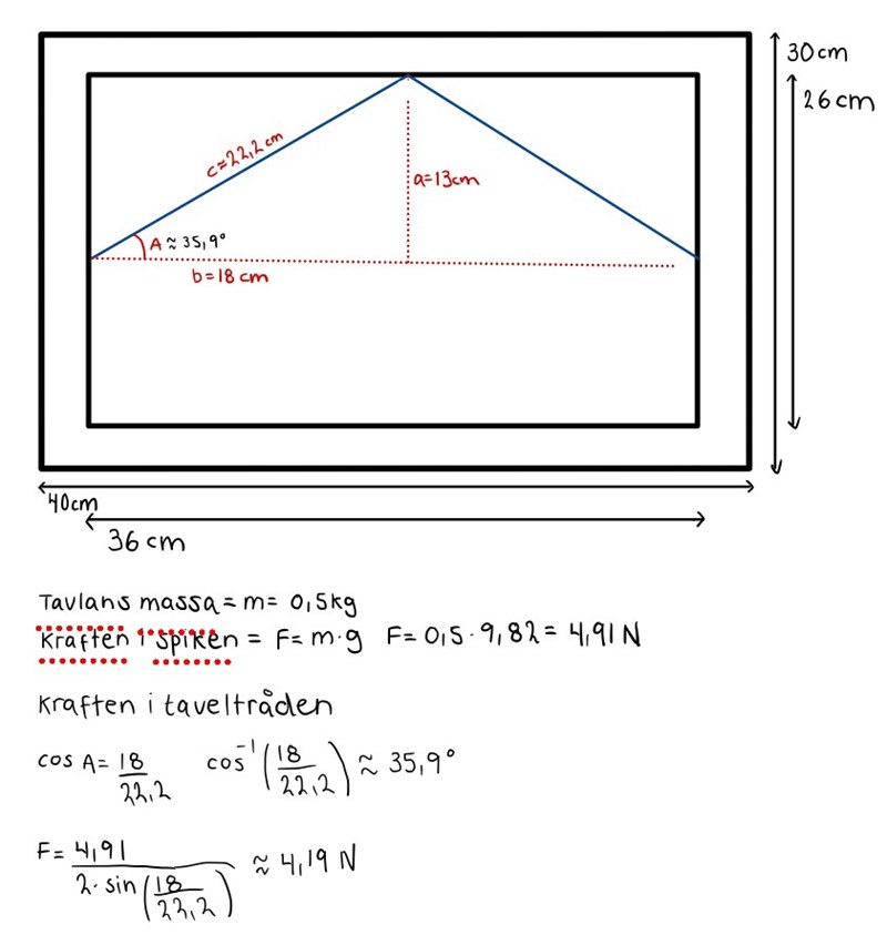 Spännkraften som verkar i taveltrådens två fästpunkter är cirka 4N. Detta är den horisontella kraftkomponenten i tråden och beräknas ur tavlans tyngdkraft dividerat med vinkeln i tråden och siffran två, då tråden har två fästpunkter.