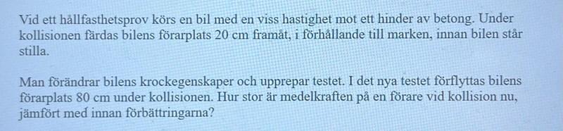 Rörelseenergin hos förare+stol skall då omvandlas till ett arbete F*s. Kraften börjar verka precis i krockögonblicket, och håller på tills hastigheten är nere i noll. Under den tiden har förare+stol rört sig sträckan s.