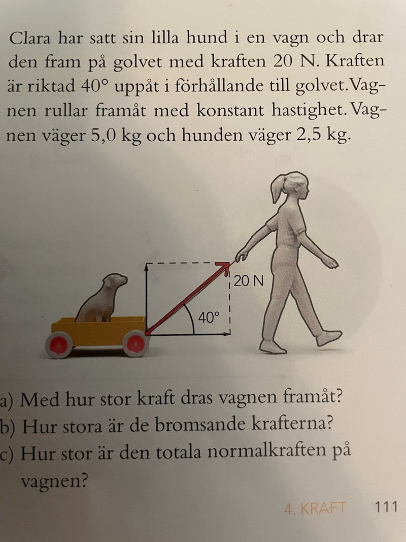 Hur ska jag tänka? Jag tänker att normalkraften är tyngdkraften - friktionskraften, och sedan går det en kraft uppåt om man delar upp den från det hon drar i komposanter, och den tar ju också ut tyngdkraften, så tyngdkraften borde tas - det tänker jag. Men det blir fel så man tar nog inte -. Hur gör man på en sån här uppgift?
