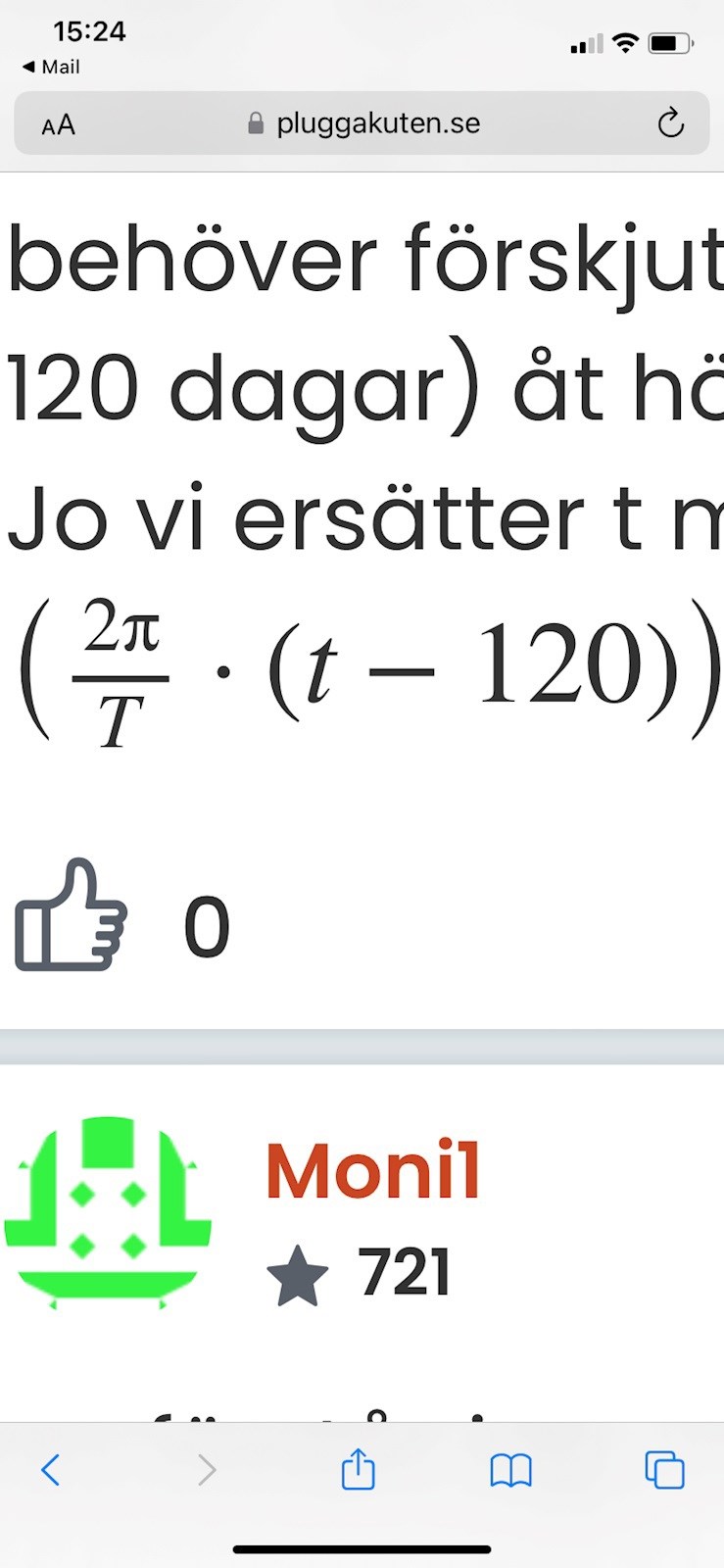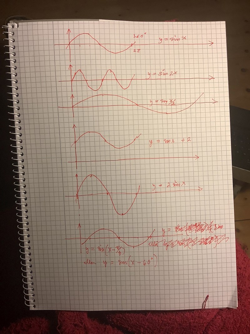 Jag kanske får fråga min lärare. Det är nog enklare att förklara vad jag menar då. Märke redan när jag skrev inlägget att det blev väldigt rörigt. En sista sak jag kom på nu när du skrev det senaste inlägget. Är perioden här sin (4x–120°) 360? Och här sin [4(x–30°)] 90 efter att jag bryter ut 4?
