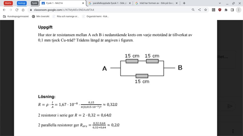Tjockleken var given som 0,1 mm. Det är diametern. Tråden är runt, tvärsnittsarean är ytan av en cirkel, som din formelsamling säkert ger ett uttryck för: där är cirkelns radie.