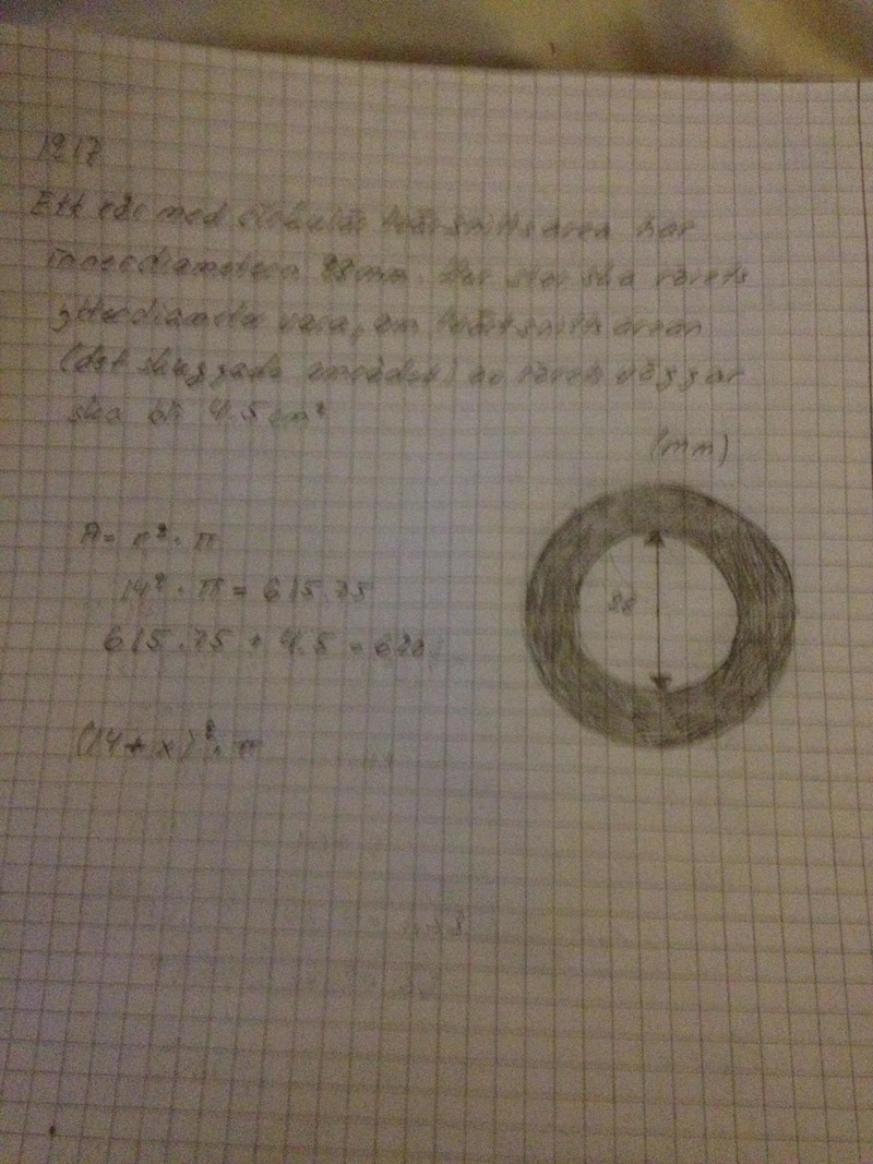 Du är nästan i mål, du har alltså kommit fram till att radien i kvadrat är ungefär 3.39 cm^2, hur stor är radien då? Sen tänk på att dom frågar efter diametern och inte radien!