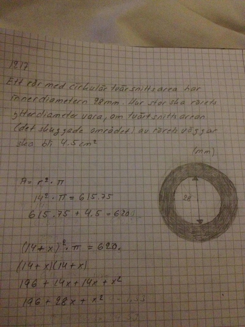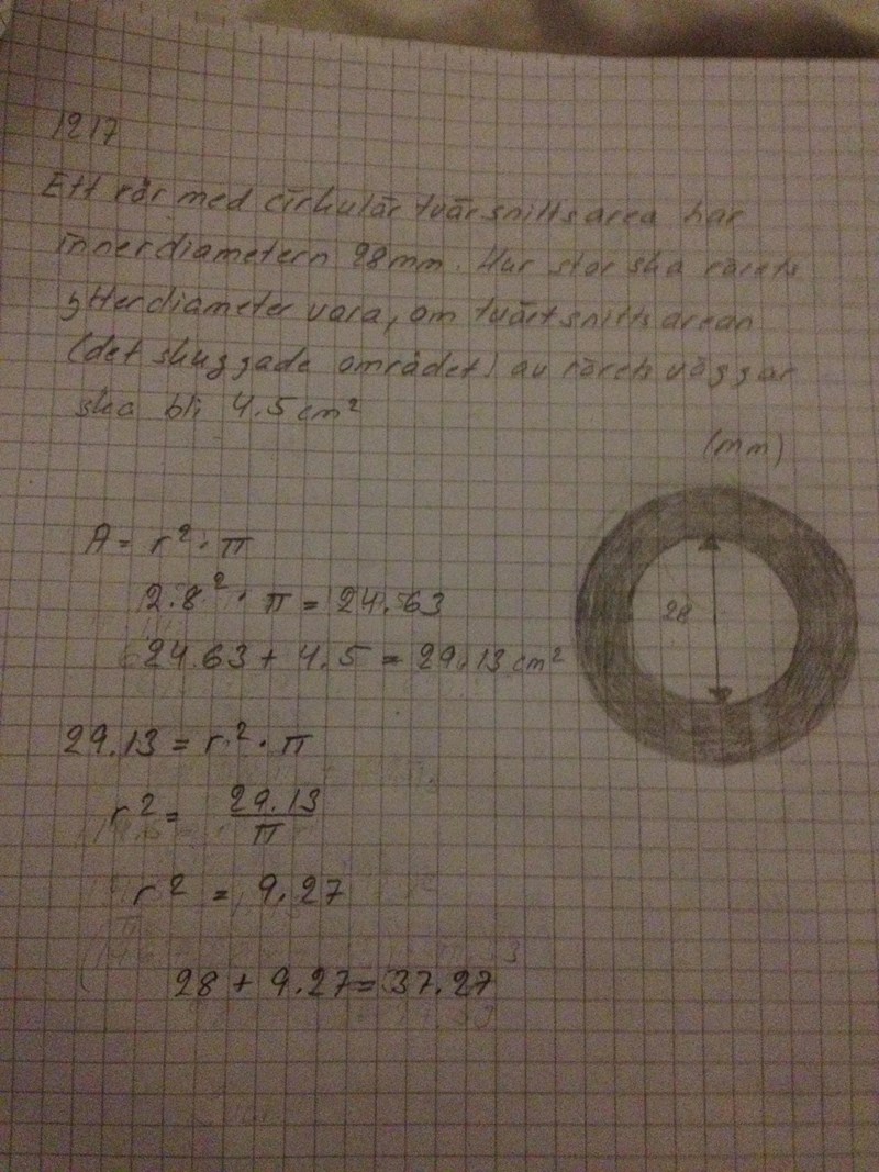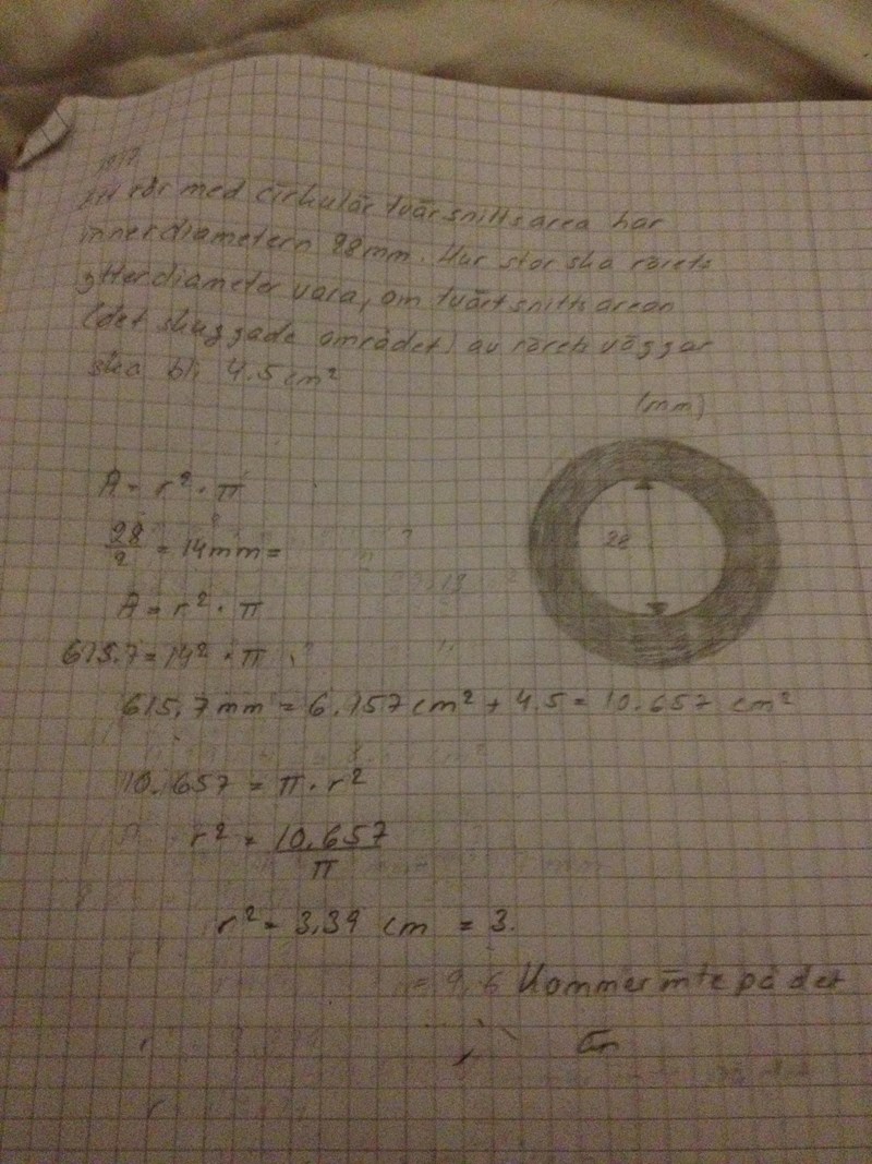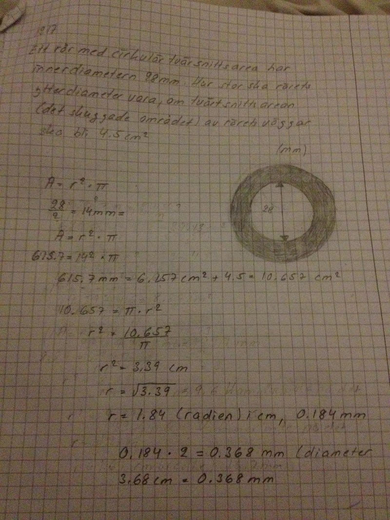 Först har du räknat ur arean av själva hålet i mm^2. Sedan adderar du tvärsnittsarean i cm^2. Det blir fel. Du kommer att få ett rör med väldigt, väldigt tunna väggar på det sättet.