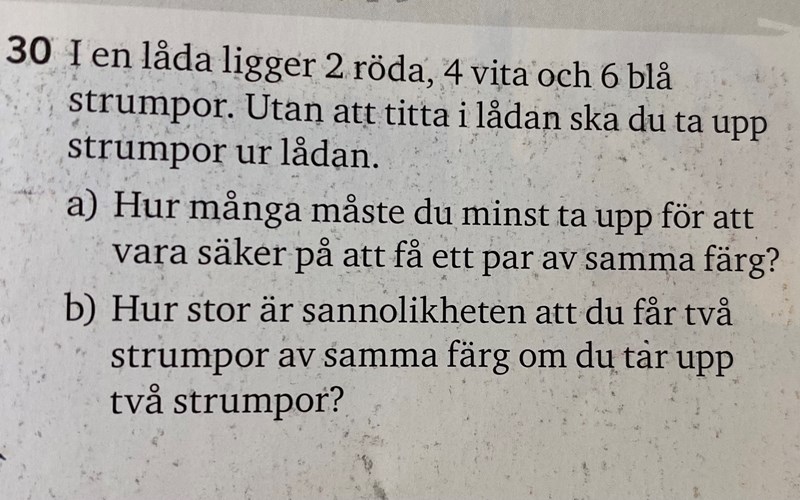 Jag behöver hjälp med fråga b, jag har ritat upp ett träddiagram och försökt räkna ut sannolikheten, men det blir fel. Det jag gjorde var att jag räknade ut sannolikheten för att ta upp 2 av samma färg för respektive färger. Tog alltså (röd) 2/16•1/15 + (vit) 4/16•3/15 + (blå) 6/16• 5/15. Det är ju uppenbarligen fel. Så hur ska man tänka?