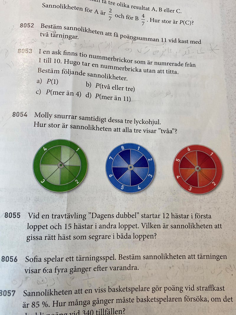 Hej, jag behöver hjälp med fråga 8054. Jag har försökt lösa uppgiften genom att ta 1/4 * 1/8 * 1/6 men det blir fel. I facit står det 1/128 men fattar verkligen inte hur.