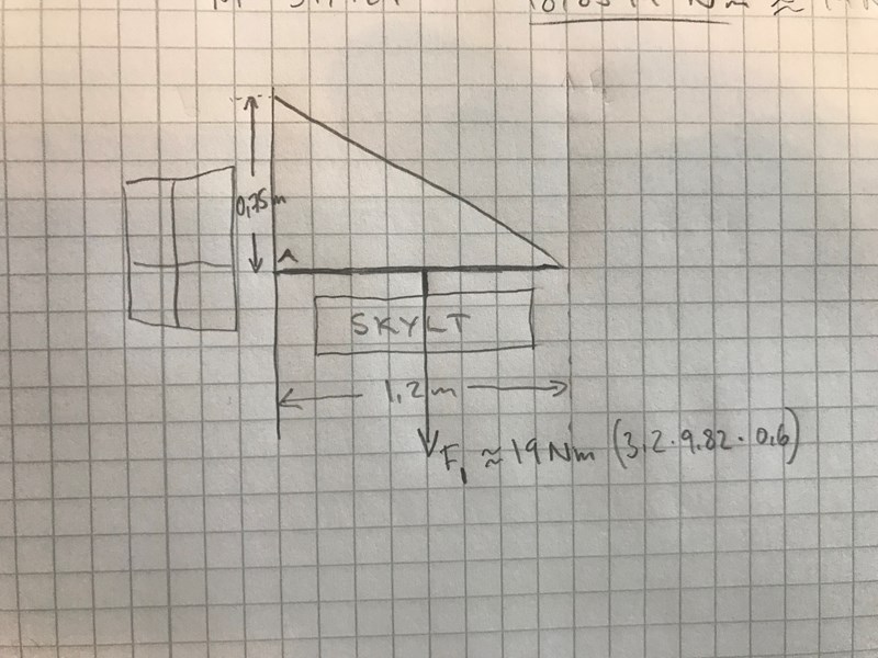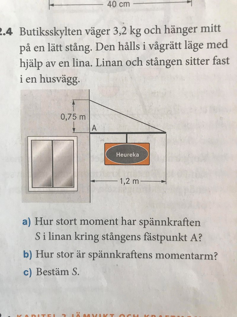 Har fastnat på uppgiften ovan, fråga A fick jag åtminstone fram rätt svar på, men tycker ändå formuleringen är oklar. Jag har ju bara räknat ut momentkraften utifrån vikten på skylten och dess avstånd från vridaxeln (väggen). Tänker att jag då får veta rotationskraften medurs och linan borde därför verka med samma kraft moturs.
