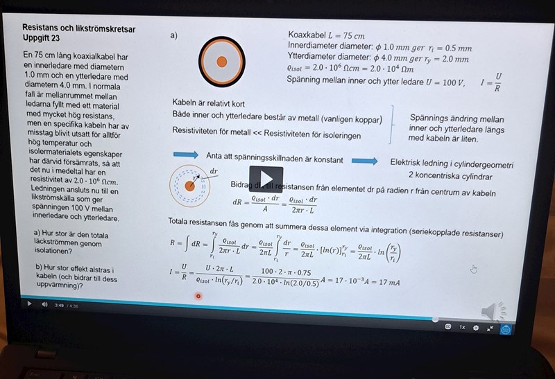 I videon säger hon att vi har seriekopplade cylindrar och därför summerar vi totala resistansen vilket jag inte kan se från figuren de ritat och figuren är inte heller tydlig nog. Jag undrar också varför vi skall integrera mellan de här radierna och hur det skiljer sig från R=rho*L/A?