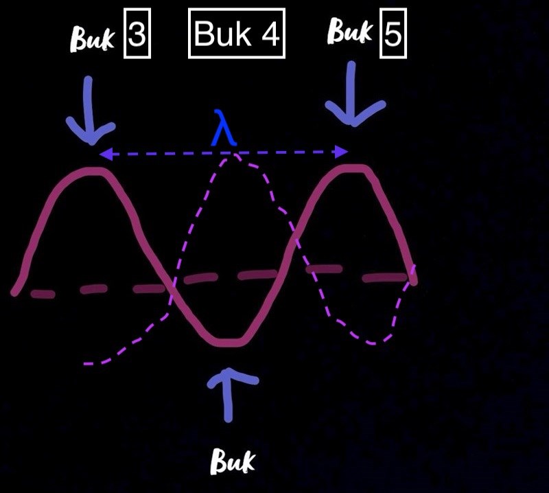 Du skrev att du "tänkte att avståndet mellan den tredje och femte buken är 1,5 våglängd".