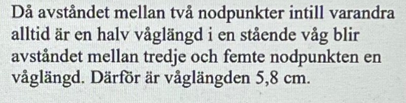 Jag håller på med denna uppgift. Jag tänkte att avståndet mellan den tredje och femte buken är 1,5 våglängd i och med att en våglängd består utav 2 bukar, så mellan 3 bukar bör det därför vara 1,5 x 5,8 cm = 8,7 cm. I facit däremot så pratar dem om nodpunkter istället för bukar, och ja, då förstår jag att avståndet mellan 3 noder är en våglängd, men nu handlade ju uppgiften inte om 3 noder, utan 3 bukar. Så jag förstår inte riktigt varför mitt svar är fel och hade därför uppskattat om någon kunde förklara det för mig.