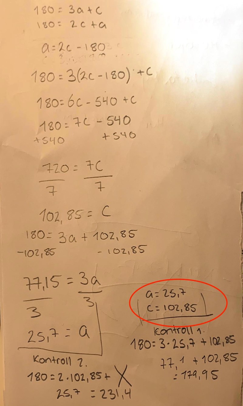 180=2c+a (2)har jag kommit någon vart då?