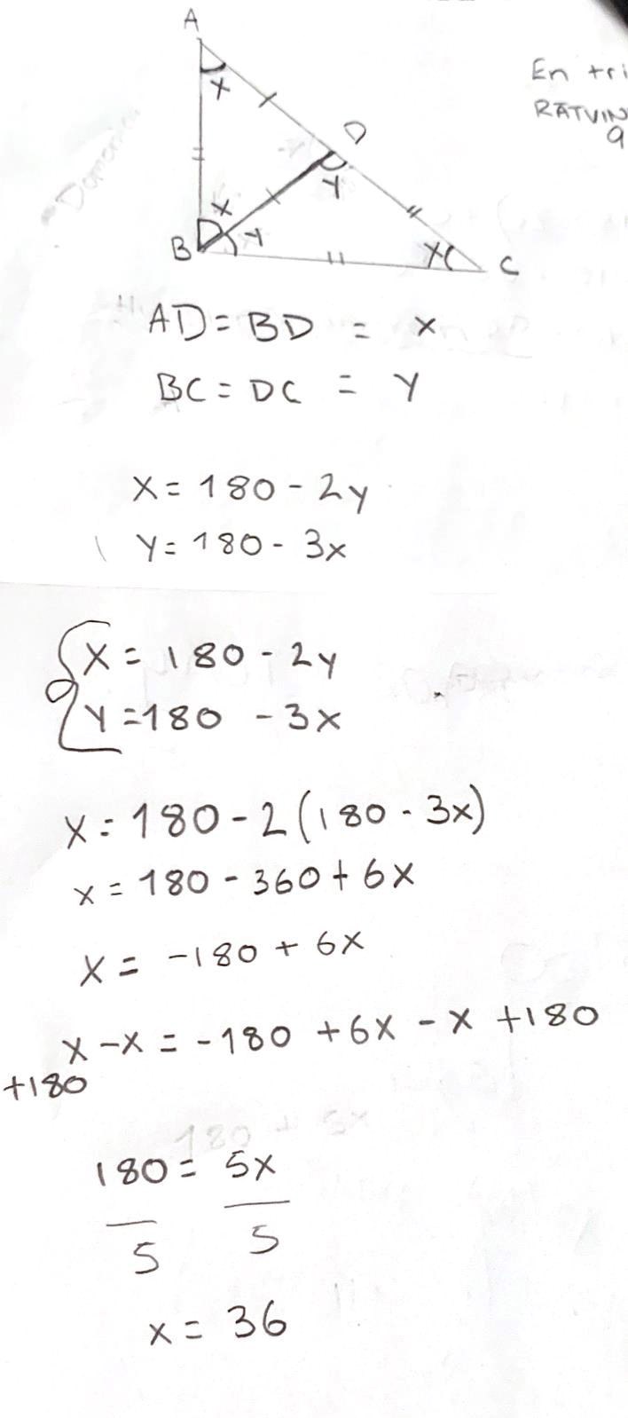 Vinkel B kan delas in i två vinklar. Vi kallar de för vinkel a och b där ABD=a och DBC =b. Då sträckan BD är lika lång som AD vet vi att vinkel(a)=vinkel(A).vi vet då att vinkel(A)=vinkel(C)=vinkel(a)