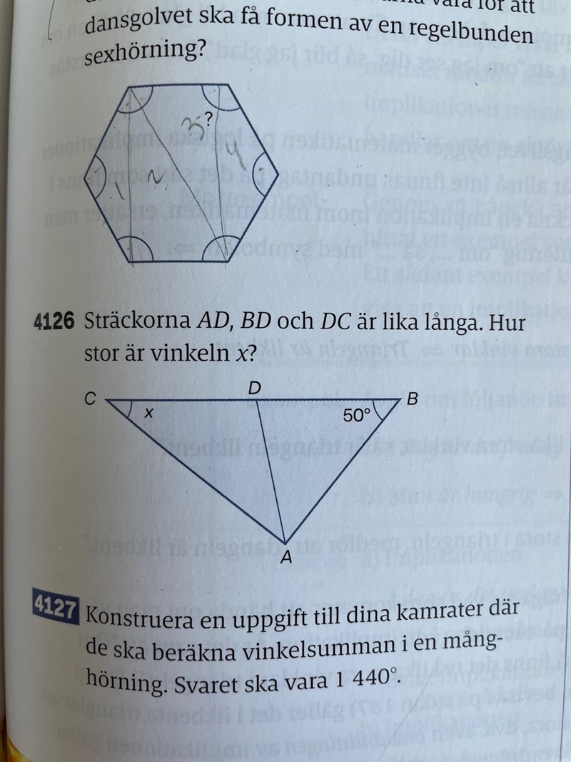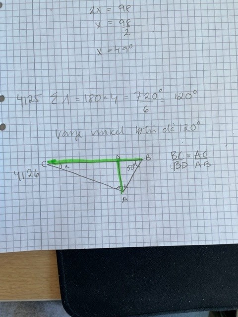 Tack Yngve, Min avbildning stämmer ju inte. Om jag tittar i uppgiften så skulle triangeln vara likbent i ^AC och ^BC och skulle då ^A vara 5o grader eftersom två vinklar i basen alltid är lika stora så ger det summan 100 och då borde x vara 80 eftersom vinkelsumman i en triangel är 180 grader. Men det stämmer inte, ska bli 40 grader.