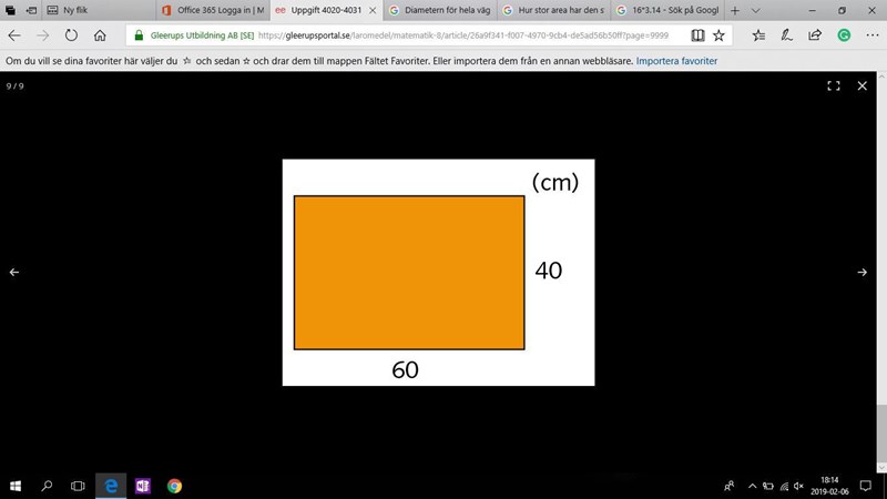 Hur stor area har den största cirkel man kan rita in i rektangeln - lyder frågan. Jag har ingen aning om hur man räknar ut detta typen av problemlösning, men jag gissade att man borde använda sidan av rektangeln som diametern(40 cm), men det blev över rektangelns area.