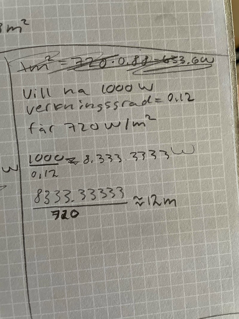 Men nu kan vi bara ta vara på 12 % av solstrålningen, så för 1 m2 solceller kan vi bara använda 0,12.720 = 86,4 W. För att få fram 1 kW behöver vi alltså 1000/86,2 = 11,6 m2.