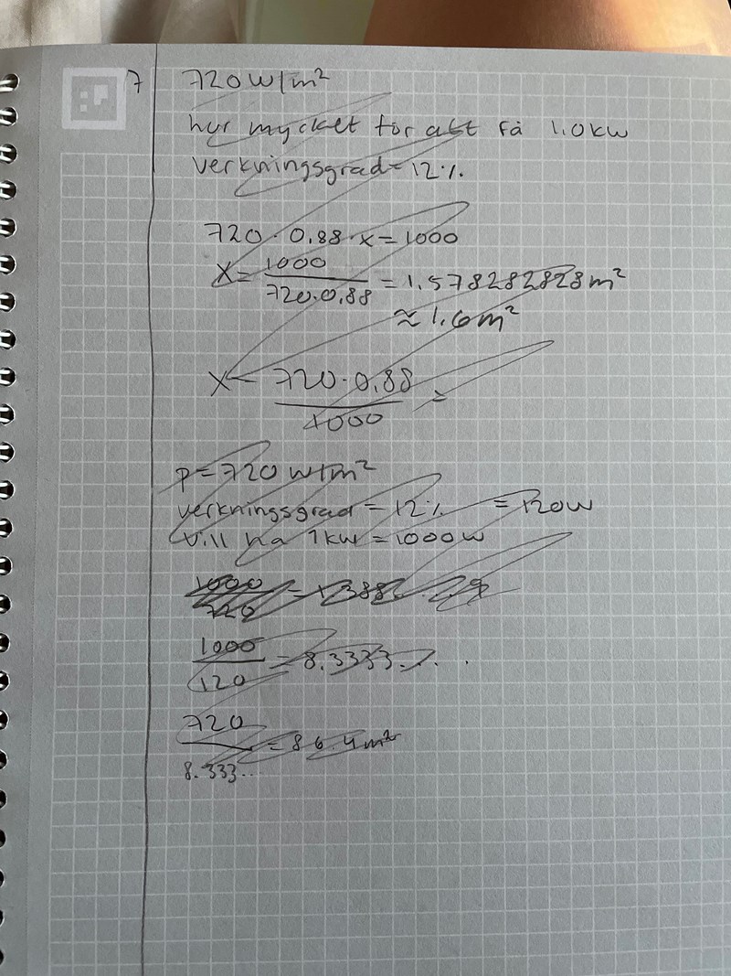 vid ett tillfälle är instrålningen från solen 720W/m^2. Hur stor are skulle behöva täckas av solceller för att få ut effekten 1,0kE, om solcellernas verkningsgrad är 12%?
