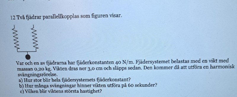 Smaragdalena skrev:Om du har två fjädrar som hänger efter varandra (seriekopplade) och hänger en tyngd längst ner, så kommer varje fjäder att förlängas med , så hela fjädern förlängs med . Det betyder att fjäderkonstanten blir hälften av vad den var från början. Det ä ralltså stor skillnad mellan om fjädrarna är seriekopplade eller parallellkopplade.