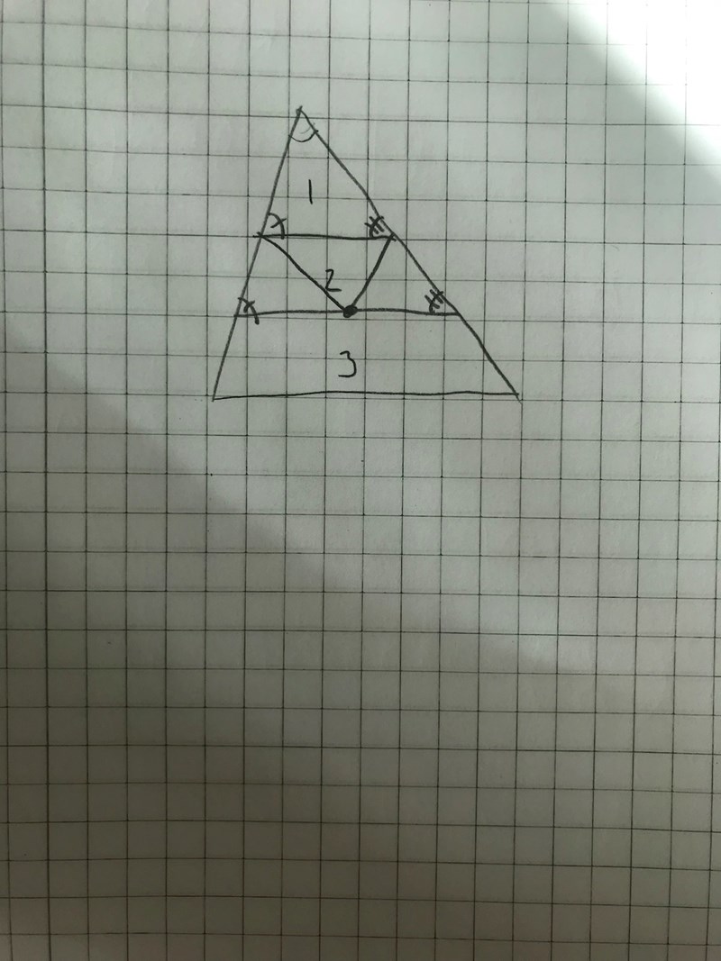 Smaragdalena skrev:Markera en punkt på mitten av linjen som är gränsen mellan område 2 och 3. Dra en linje från denna punkt till vardera änden av linjen som är gränsen mellan område 1 och 2. Räkna trianglarna. (Alla dessa trianglar är likformiga. Är du med på varför?)