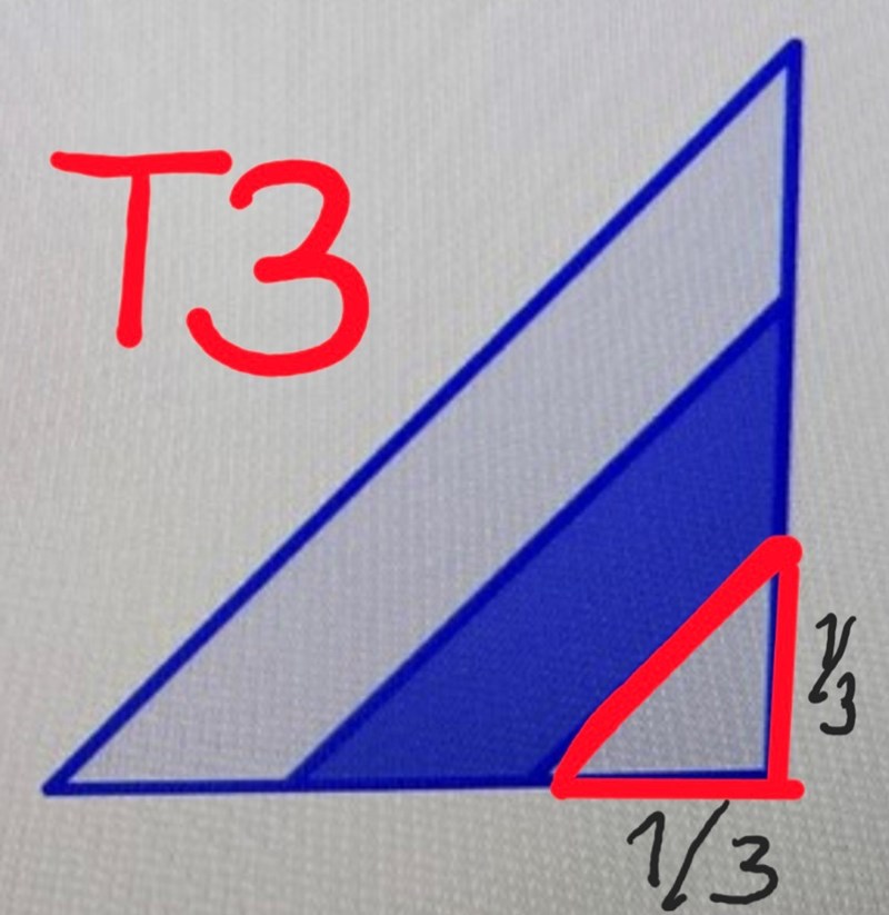 Använd b*h/2 för att räkna ut varje triangels area.Om du tycker att det blir enklare kan du i stället säga att T3 har bas och höjd = 1,